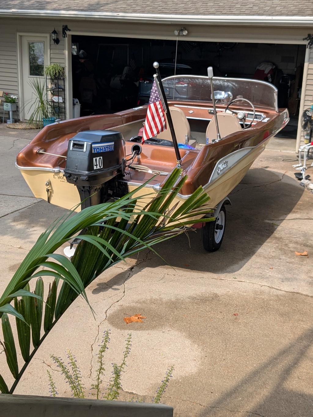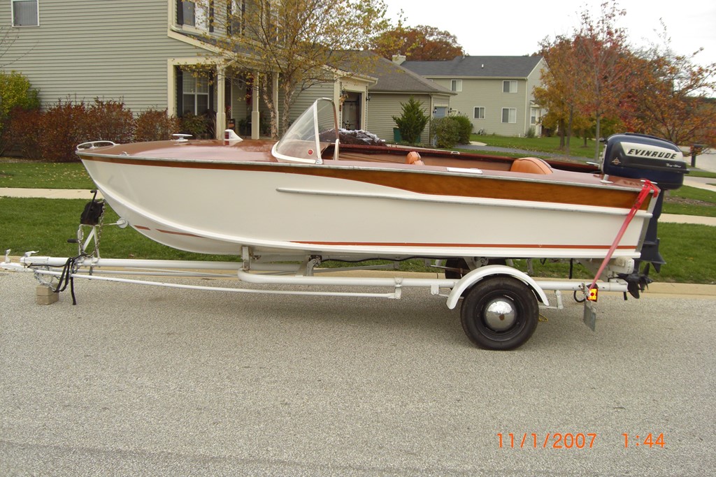FOR SALE: 1956 Borum Runabout Plywood 19'L w 6'bow, Brown Stain with white paint. 1956 Gator tip-Trailer with spare tire & boat cover. All original (add-on Electric Start & Safety light). Manufactured in Florida & Purchased in Chicago, I have the original sale purchase documents. I'm the 2nd owner since 2005. The boat has been in dry storage since 8/2008, when my wife was diagnosed with cancer & she passed away, as this was her boat I haven't had the heart to put it back in the water since then. I'm retiring and want to sell it now.