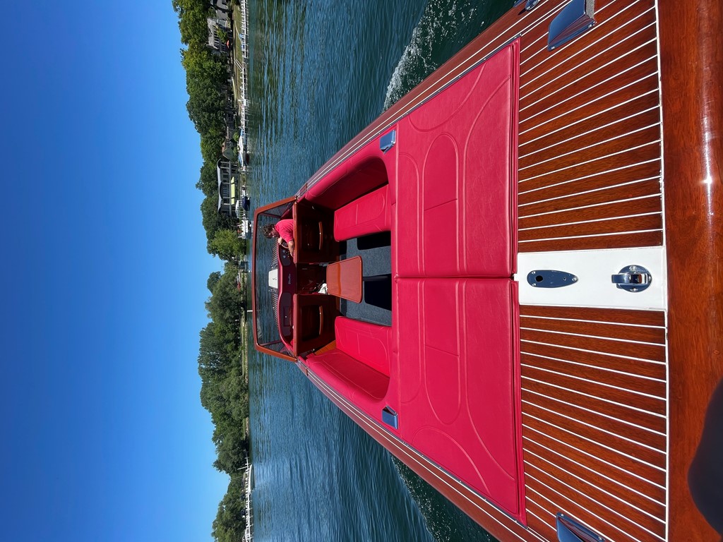 Q and A with owner. You've owned other types of boats, why did you choose a Streblow? I love old boats. There’s a nostalgia about them, an eloquence, and of course “If wood could talk”. I also have a 1962 Boston Whaler 13’ Sport and a 33’ 1979 Chris Craft Corinthian. All fully restored. The Chris Craft was delivered to slip 942 here at the Abbey and has been there ever since. As far as a Streblow, I rode in my first Streblow owned by Bill and Karen Rolander. I was 16. My mother and I were visiting the Rolanders in Buena Vista. I fell in love with Streblows as soon as I saw and heard it. I was 16. Even though at the time it seemed unlikely, I told my mother, Lorraine, I would own one someday. She told me if I studied and worked hard anything is possible. Now it took four decades, but… Your favorite thing about this boat? The lines, everything flows together seamlessly. That’s the majestic beauty of a Streblow. What's the best compliment you've received about this boat? Holy sh.. What is your favorite thing to do in this boat? Example cruising with family , water sports, float and soak in the sunshine, a sunset lap? A sunset or fall colors cruise, but also showing off its enormous power, and handling. Plus the trumpet horn is fun too, especially at fireworks. The boat is named Lorraine, for your mother I've been told. How does she like the boat and or the name? Mom passed quite some time ago, but I always remembered what I told her so many years ago at 16 and more importantly what she told me. I named the boat after Lorraine in her honor. I guess you can say “My mother the boat”. We digitized her name from a legal document she signed years ago. We enlarged it to what you see today on the transom. What is so amazing is that her signature is written freehand! Does anybody remember cursive? All in all, a great boat, with a great history! Description of the Boat: This 26' V-drive was the first of its kind. While the motor was installed by the previous owner, there was more Don wanted to see updated on the boat. We started by adding a "Jet-Thruster" system. This system allows for the boat to navigate in even the tightest spots with ease. Then we gutted the interior. The old engine box was a removable piece of plywood that had a snap cushion attached by various snap fittings. This made it difficult to show off the power house of the boat. We crafted the "winged" engine box, powered by electronic hatch lifters. This made the motor much more accessible. Moving towards the captains chair, we removed the old swivel seats, and built a stationary driver and passenger seat. Don's main goal was to give it a traditional Streblow look with sleek lines. These stationary seats gave us real-estate to add some wood accents on the backsides of the seat. With the back sides of the seats being embodied with wood, we took to the lower ceilings. Don wanted there to be wood planking on the interior of the boat. Streblow did just that. With the interior bones updated, we needed to pick out the color. After many options, "American Beauty" (red) was the final decision. With the red interior, the blue carpet made the boat a true American beauty. The gauges were custom built by Livorsi in Grayslake, Illinois. With the interior of the boat complete, we moved to the exterior. We completely stripped its previous varnish and stain, and went with a darker stain. The final addition, was the "Zip-Wake" trim tabs. This system completely perfected the handling that Streblow's are so known for. With the interior and exterior of the boat completed, this boat is truly an American Beauty.
