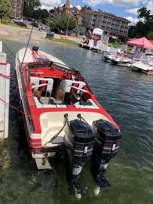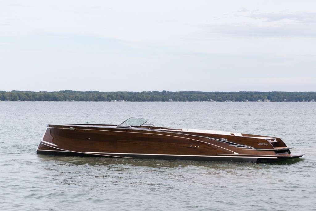 A crown jewel amongst the Streblow fleet. This boat encompasses the craftsmanship that is "Streblow". From its raw beauty to its ability to conquer even the roughest of waters. The Captain, Edward Cox, listens to his Jimmy Buffet album as he reminisces on all the great times he had working alongside Randy Streblow. The photo depicts a snapshot from the annual "Wake The Lake" - a tribute to the late Larry and Randy Streblow, who are the two men that blessed us with these beautiful masterpieces. Randy and Larry's legacy lives on through boats like "The King."
