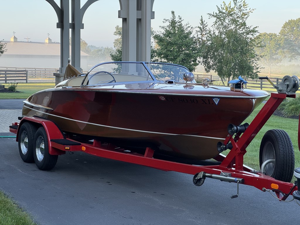 A premier molded mahogany plywood runabout. Rare 35HP 4-cyl vertical inboard power. This unique boat is available to a new owner.